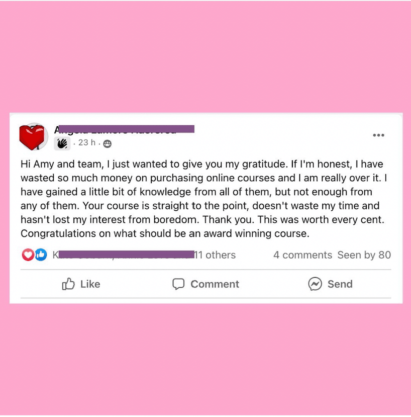 Answers: "The course is designed to be flexible and you can take it at your own pace. You will have lifetime access to all the materials, so you can go through the modules and complete the assignments at your own convenience. The weekly calls are recorded, and you can ask your questions in the Facebook group and have them answered quickly. That way you can continue to learn and progress at your own pace, even if you are busy."